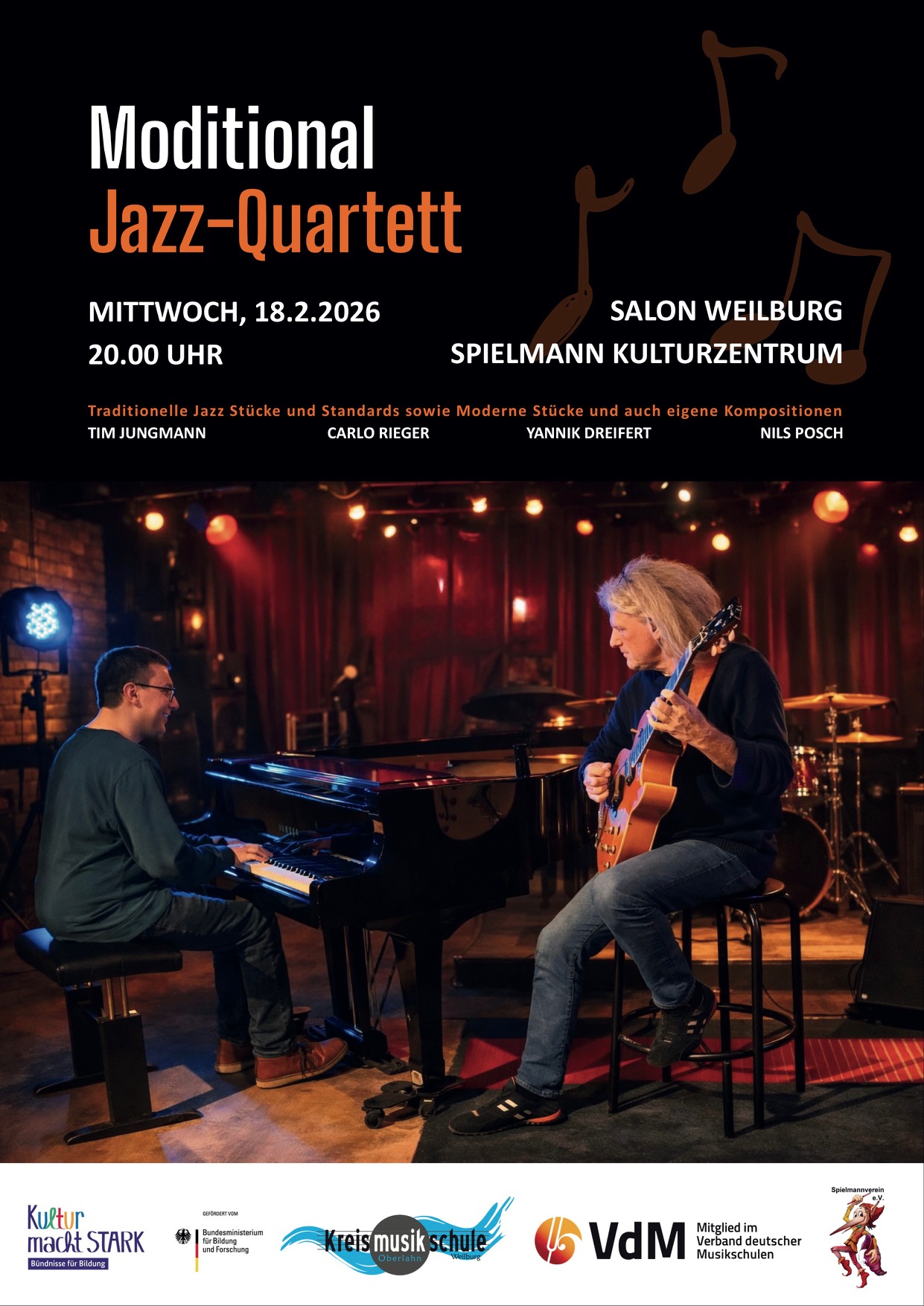 04Feb.4. Februar 2026 Jazz im Salon Mittwoch, 18.2.2026, 20.00 UhrSalon Weilburg, Spielmann Kulturzentrum Moditional Jazz-QuartetTraditionelle Jazz Stücke und Standards sowie Moderne Stücke und auch eigene Kompositionen.Tim JungmannCarlo RiegerYannik DreifertNils Posch Share on Facebook Share Send email Mail Print Print